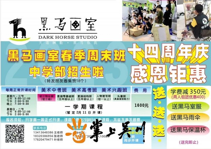 #2023吴川黑马画室春季周末班火热招生中,中学部开课时间2.11,少儿部开课时间2.9日开始上课了,吴川黑马画室成立于2009,以教育培训,以美育人理念。开设有中学部、少儿部,中学部(四年级以上)有高考美术班、中考特招班、成人兴趣班、漫画班
